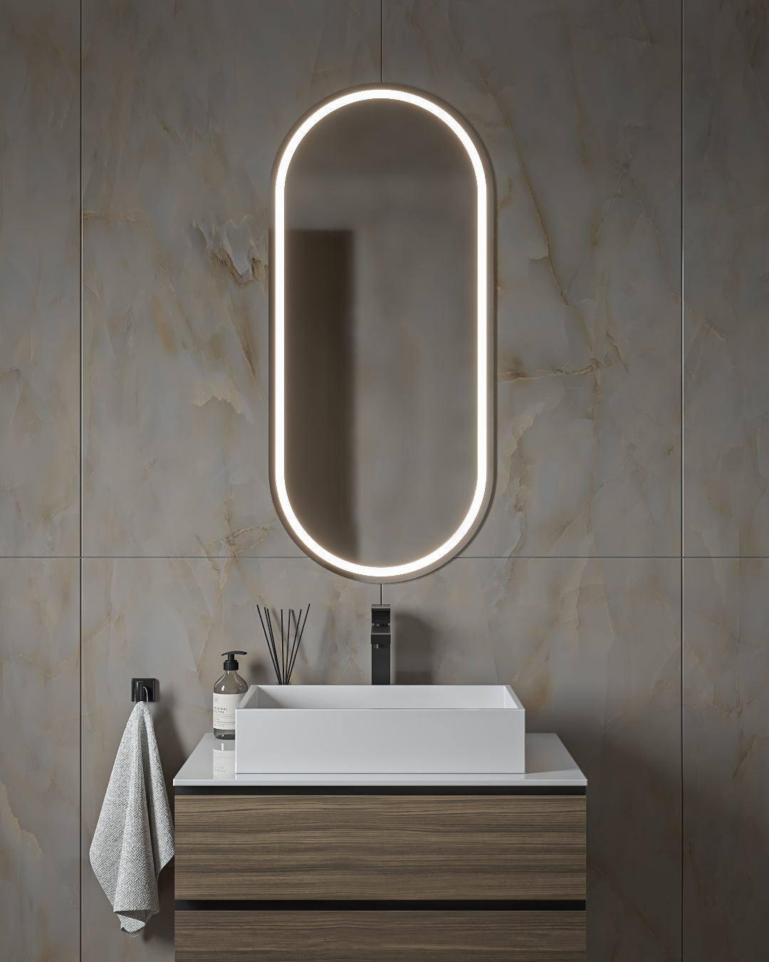 Καθρέφτης κρεμαστός, SEMI OVAL MAT με οπίσθιο και εμπρόσθιο περιμετρικό φωτισμό LED